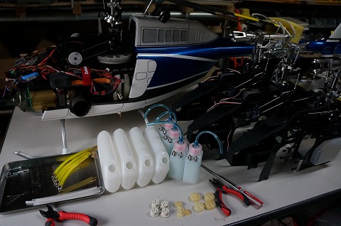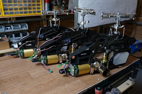 大阪から昨日の日程でM氏が引取りに来ました。大型エキュレイユはドイツのヘリファクトリー社でベース組立、弊社ではテールドライブ回り、テールリンケージ回り、テールギアBOX取付け、LED取付け設定、スワッシュからヘッド回りの組立、ヘリコマンド設定および位相のセッティングを行い納品。今後はM氏がフライトまでのセッティングを行います。エンジンはJakadofski社のPro5000仕様なのでかなりハイパワーです。ボディーもVario社製と違い、かなり軽量なのでカッ飛び系になることは間違いないでしょう。丈夫な仕上がりになっているので、90クラスと変わらない飛びが可能だと思われる。フライトが楽しみな機体です。プロポは最新Futaba14SG,