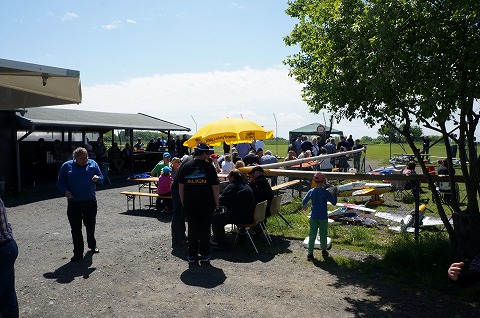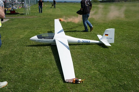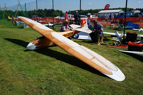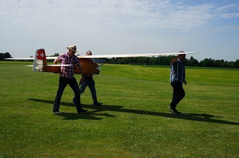 ▼今回、ヘリファクトリーの紹介で知り合ったガングさん、やばいです、このグライダー重量20kオーバー、スパン7.5m、よく飛んでいました。