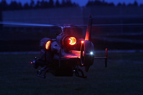 ▼テールに白いLEDはエンジンの調子とヘッドの回転数、燃料の残量など問題が発生するとLEDの点灯リズム変化で何が問題なのかが分かります。勿論、プログラムが必要です。LEDが点灯状態だと正常ということになります。コクピット左右の緑、赤の航空灯もエンジンの動作状況と連動しています。エラー時の警告灯にはなっておらず、あくまでも現在の動作状況を点灯で表します。エンジンを停止すればLEDは消えます。このシステムはJetcat社製PHT2,PHT3シリーズ、PST5Hシリーズにセッティング可能です。
