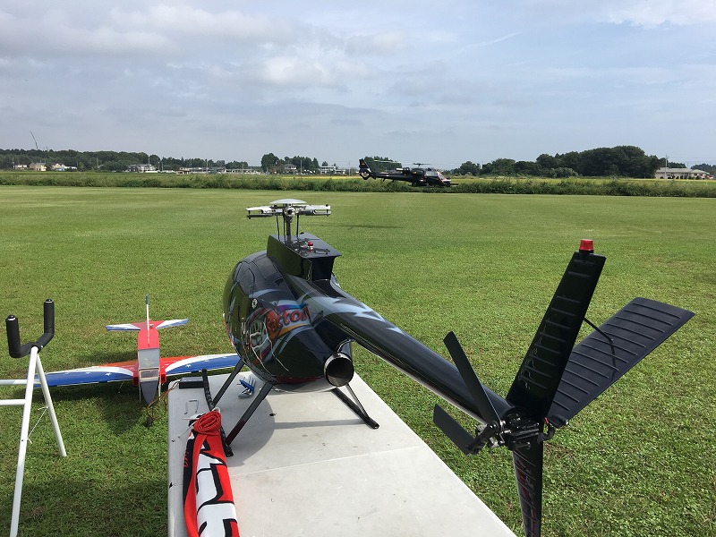 ▲2か月ぶりのHughes500のメカの一部がトラブルを起こし、急遽、修復。JETCATのエンジンは絶好調なのにメカが。この後、フライトし絶好調に回復しました。久々に飛行場で分解の巻。